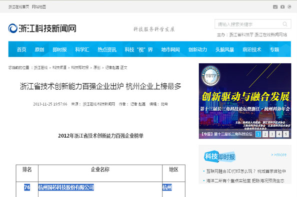 在2013年11月25日召開的浙江省技術(shù)創(chuàng)新能力百強(qiáng)企業(yè)評(píng)價(jià)網(wǎng)絡(luò)新聞發(fā)布會(huì)上,浙江省科技發(fā)展戰(zhàn)略研究院和浙江省科技信息研究院作聯(lián)合發(fā)布了2012年度“浙江省技術(shù)創(chuàng)新能力百強(qiáng)企業(yè)”評(píng)價(jià)結(jié)果,杭州國芯科技股份有限公司榜上有名。省科技信息研究院書記、副院長應(yīng)向偉表示,這100家技術(shù)創(chuàng)新能力百強(qiáng)企業(yè),有望成為浙江自主創(chuàng)新和轉(zhuǎn)型升級(jí)中的“領(lǐng)頭羊”,帶動(dòng)提升我省的產(chǎn)業(yè)核心競爭力。此次發(fā)布“浙江省技術(shù)創(chuàng)新能力百強(qiáng)企業(yè)評(píng)價(jià)”結(jié)果是為進(jìn)一步激發(fā)企業(yè)創(chuàng)新活力,發(fā)揮科技創(chuàng)新工作的引領(lǐng)作用。