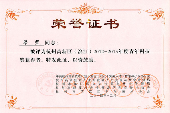杭州國芯科技股份有限公司( NationalChip )梁堅榮獲杭州市高新區(qū)“ 2012 — 2013 年度區(qū)青年科技獎”。